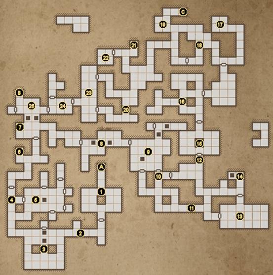 当你探讨隧道附近(20),你可能会听到开门的声音在远处。回溯到这个显着的位置,你会发现墙上已经打开,露出了两个巨大的蜘蛛。这些巨大的蜘蛛之一,拥有一把金钥匙打开(25)的门,地板上有两个药草