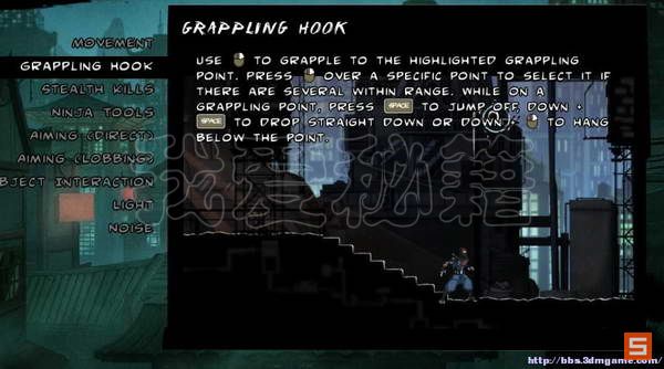 之后我们来简答说明一下游戏的进阶操控部分。鼠标右键为释放抓钩,玩家可以使用抓钩跳跃到极高的平台之处,相当有用的技能 WS+SPACE则是向上向下平台跳跃
