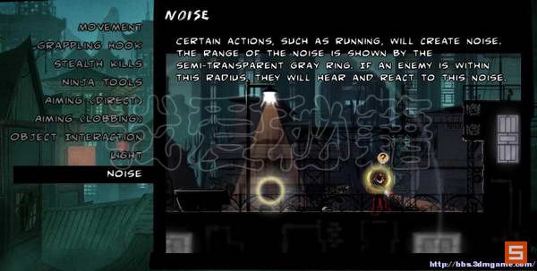 最后则是声音的说明,声音和灯泡的碎裂以及其他的互动物件都会引起附近敌人的注意力。而且以下图所示的圆圈的模式表述其影响的区域,当然这只是引起注意而非警觉