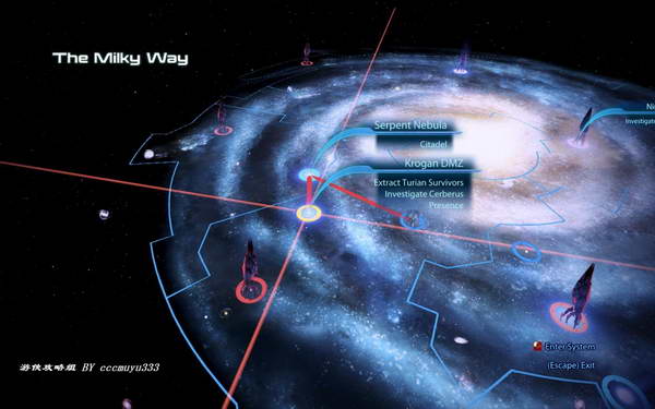 1:打开星云图,通过中继器(mass relay)来到银河系全图,点中Krogan DMZ进入后找到tuchanka星。这里显示了两个任务,先去做主线救人吧。