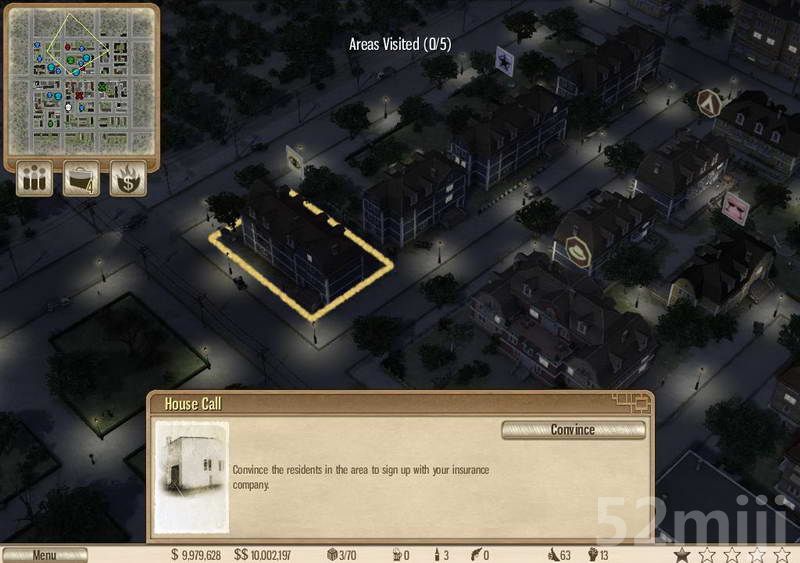 之后完成Alexy的三个任务,将你的据点升为四级并且建造保险公司,将地图所示的五个区域纳入你的保险业务范围