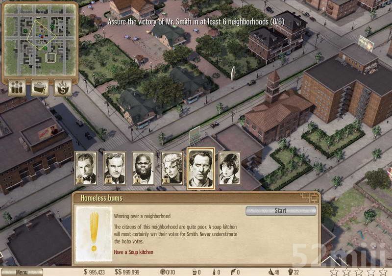 帮助 Mr. Smith赢得选举,满足至少六个区域的居民的支持。点击感叹号来了解他们的需求