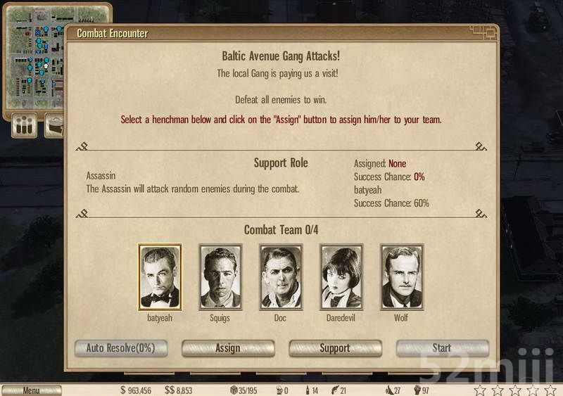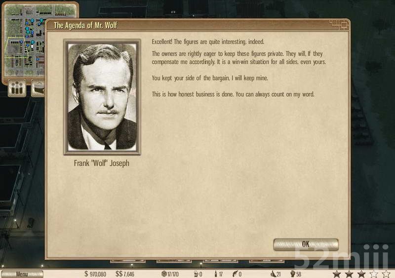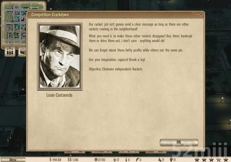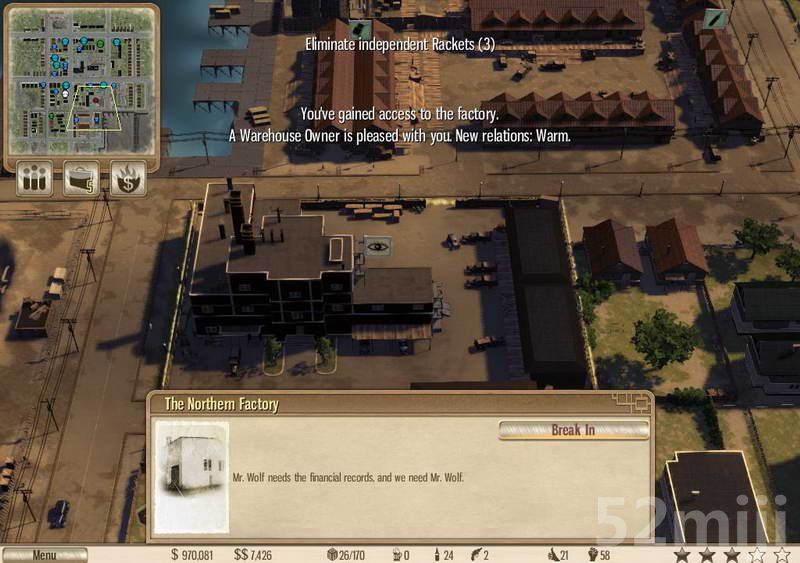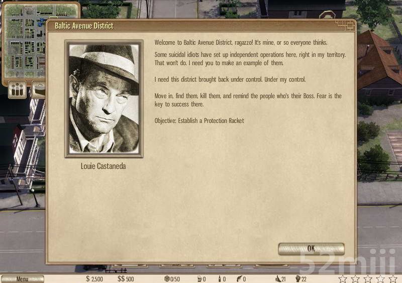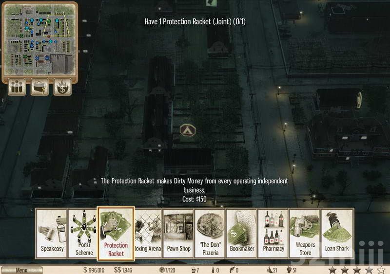 这一关大体的任务流程如下。首先建设Protection Racket,并且将你的HIDEOUT提升到2级。HIDEOUT到经营后期一定要升到最高级,因为该建筑物不仅仅可以提供额外的空间,而且还可以提升你控制建筑物的生产效率和建造成本。