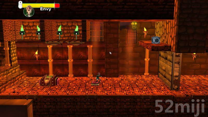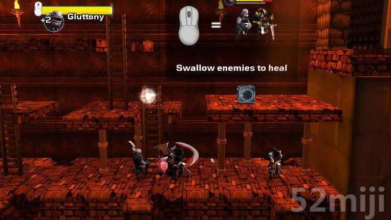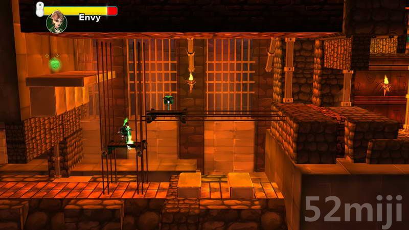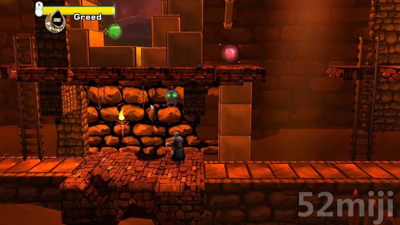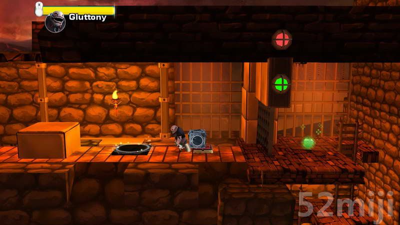 之后切换到GREED飞跃到右上平台,更换为GLUTTONY吞噬水晶球扔到下面开启机关,从而离开本区域。至此,本关卡结束