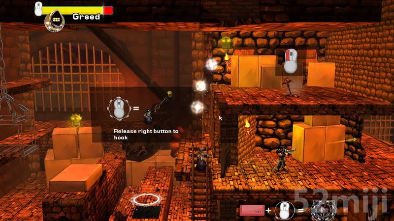 之后则是我们的贪婪,GREED. GREEDd的技能在于可释放锁链勾住各个区域的挂钩来飞跃前进,当然某些区域的机关门也需要使用锁链勾住挂钩才能打开