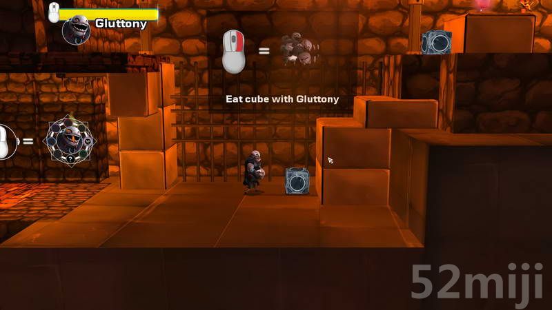 来到下一个区域。激活第三个角色,GLUTTONY。这个家伙正如其名,就是个贪吃鬼。该人物的技能可以吃掉一些较小的道具,如本关所示的水晶块