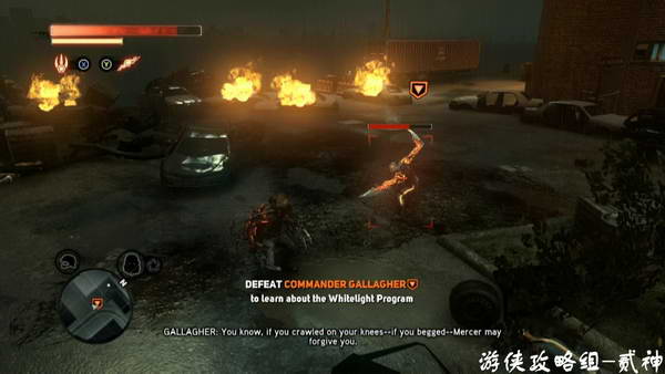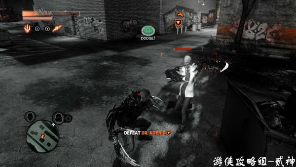 利用热扫描定位目标-目标逃脱,展开追逐(注意躲避投掷汽车)-按QTE提示破坏直升机-BOSS出现,防反跳跃即可击杀-吸收后学会手刃技能