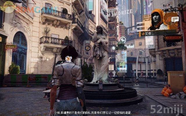 任务开始,穿过小巷到主街道,往右进到有雕像的广场。这里是贵族的休闲区,由雕像往右边下楼梯,看到有名传教士在演讲,走到楼梯右侧拾取记忆碎片(1/6)。返回广场往圣米歇尔大圆厅走,被一名机器人仆从撞倒了。
