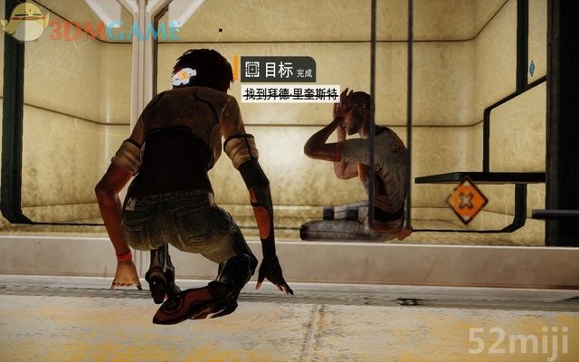 下楼梯开门进到机器人维修间,从桌上拿取记忆包(1/3)。回到楼上,打开走廊末端绿色的门,经过扫描检测进到监牢内部。听到奎德博士的声音,由右边的竖梯爬到二层找到拜德的牢房,不想牢房被转运走了。避开巡逻的哨警机器人,从栏杆跳落下层大厅,解决掉出现的精英警卫和复原突变体,随后解锁技能“迷彩”,能够使妮琳隐形30秒时间,如果受到伤害会中止隐形。在隐身状态下能瞬间使敌人超载,超载只能从敌人身后奏效。