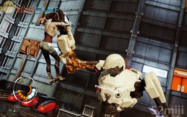乘电梯下行,出现一只白色涂装的机器人佐恩,打法如前,用脉冲打它的双臂关节,直至将它们打断,然后翻滚躲避橙光爆炸,用脉冲射击胸前的弱点,再施展终结技。QTE:踢、拳、踢。
