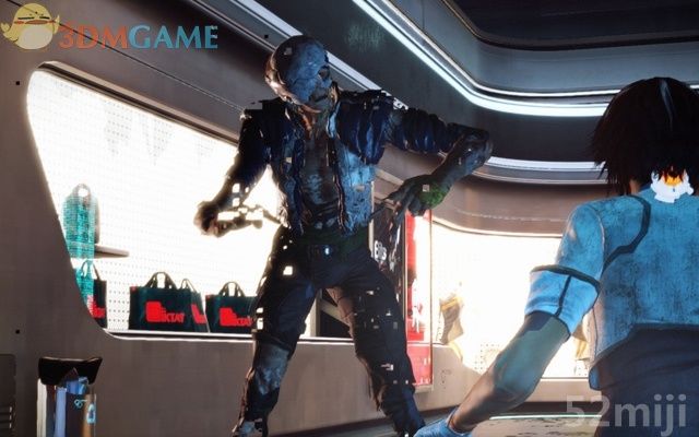开门进到电梯,升至商场看到奔逃的崔斯。沿通道往左绕,道路被几只翻掉的桌子阻住,右侧商店里倾倒的柜子上有只记忆虫子(4/11)。沿楼梯下去翻越路障,解决掉两批突变体和剥皮者。