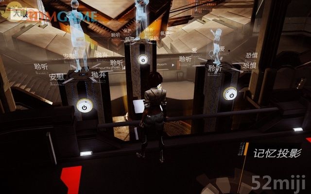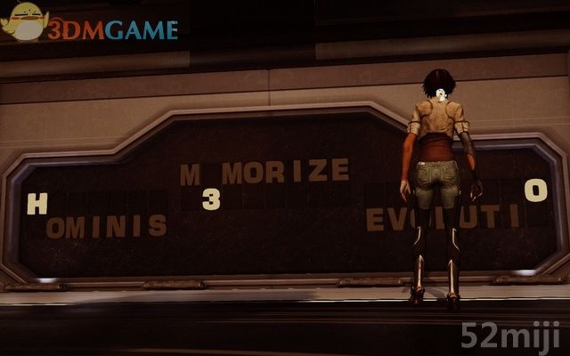 组合起来的密码就是H3O,输入到大门上,大厅升起三根柱子。走到楼梯前激活记忆投影,跟随崔斯的身影上楼梯,同步他的记忆,操作面板启动柱子上的影像。激活投影得到下一个谜题: