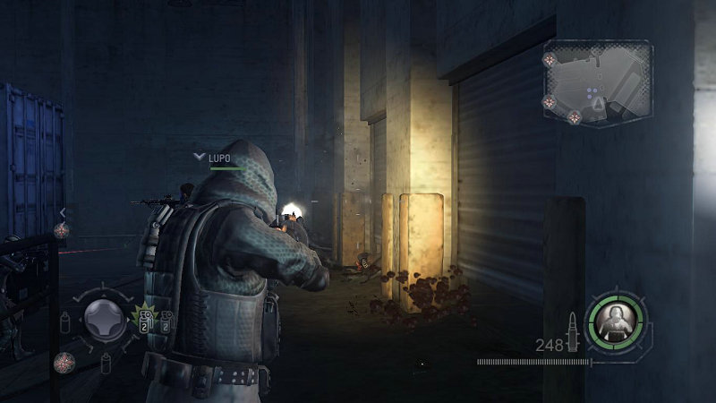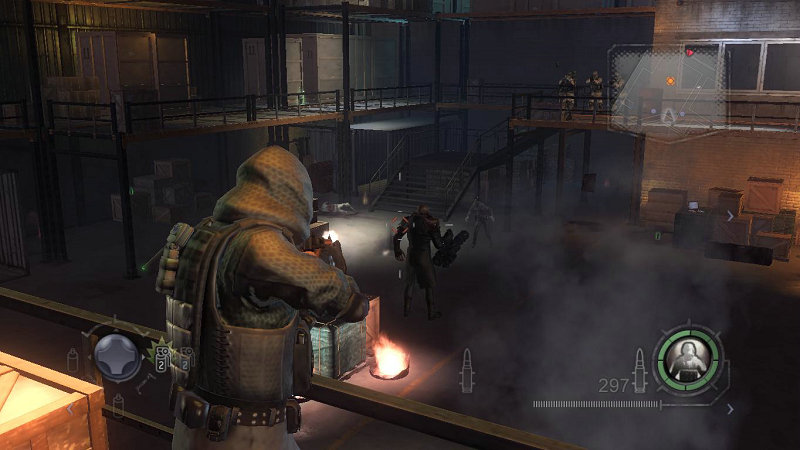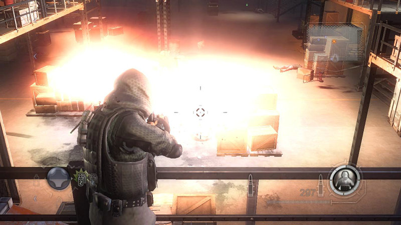 然后你需要面对是在工厂门口的美军特种部队。注意可以打爆上平台的油桶消灭敌人