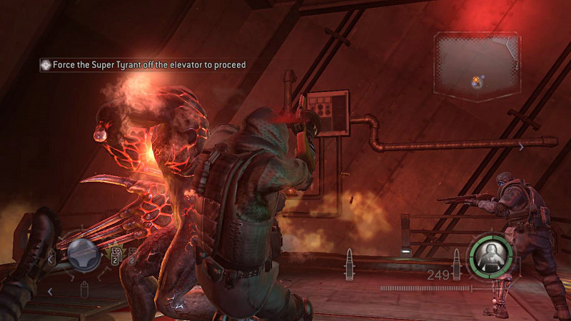 冲到最后的上升电梯,剧情发生。暴君被LEON击败掉入熔炉未死,进入第二形态