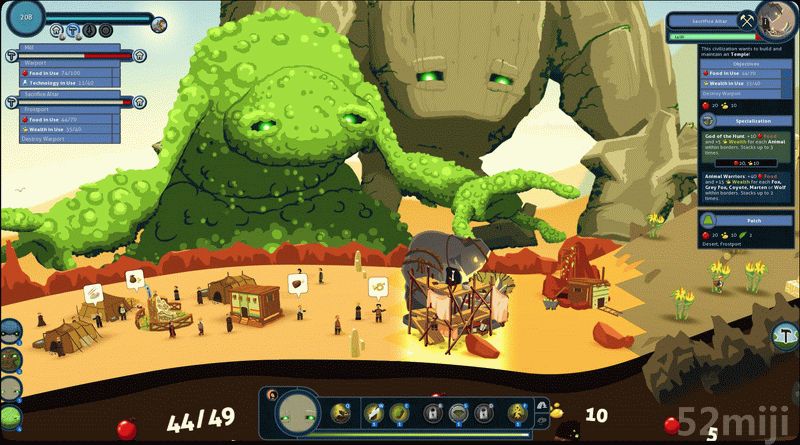 在不同地貌,创造出来的初始生物无论是形状还是生产总能量都是不同的,比如【海洋】创造的动物,在沙漠地区就是土拨鼠,在森林则是鸡,在沼泽区域则为青蛙,然后随着注入巨人的魔法,会升级成为鹿,眼镜蛇,狐狸之类,有些也存在分支升级选项,就看玩家是看重城市的经济还是科研价值了。