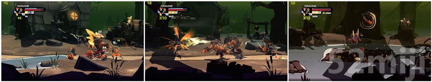 战斗分析:step1,三叉戟兽人搭着食人鱼,这回又可以使用空对地招式了,不过还是要担心三叉戟兽人进入狂怒状态;step2,前方有几只三叉戟兽人和萨满在吃火锅,先杀萨满,然后利用远程蓄力攻击与三叉戟兽人保持距离,慢慢折磨死它们即可;step3,在沼泽里会遇到两波,飞蛇+食人鱼的组合,尽量是利用翻滚+空对地的招数,先把飞蛇给宰了;step4,上岸后又遇到两波三叉戟兽人、萨满在玩烧烤,按照step2即可;step5,登上城墙,又遇到三叉戟兽人跟萨满,尤其在城墙上,空间较狭小,把敌人都控制在另一边,再使用远程蓄力打击,即可轻松过关。