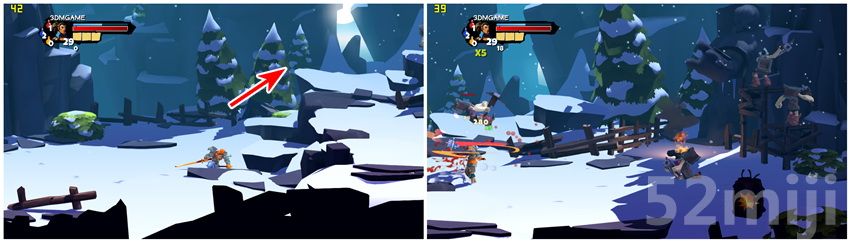 战斗分析:step1,进到场景就先要爬山,施展二段跳即可;step2,山顶上由紫色衣服的矿工守卫着,附近有2个炸药桶,注意爆炸的时机即可,矿工的伤害量不算高,可轻松通过;step3,来到冰桥上,地方较狭小可以使用远程蓄力攻击打击灰、黑山羊;step4,来到平台上又会遇到山羊、守卫者、穿山甲、惊醒守卫者(2)这帮高输出组合,如果敌人堆积嘚较多,最好还是使用绝技。因为一吓被达到100~300血,真的不是好受的。随后穿过山洞。