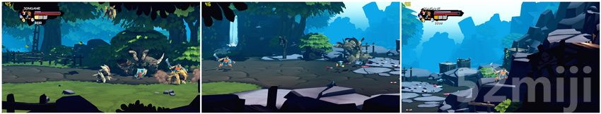 战斗分析:step1,从矿洞外出就来到了石岩森林,这里一开始就蹲守着一帮矿工,清理后登上木架前进;step2,然后就来到一吊木所在处,这里有一群穿山甲,利用弓箭射击或者主武器打击吊木,吊木就会左右摇晃,既会攻击英雄本人也会攻击敌人。面对吊木无法使用盾挡,所以要用翻滚躲避,而且吊木跟穿山甲的伤害也是比较高所以尽量使用吊木这一工具。step3.登上木架,就看见一矿工无法跳跃鸿沟而往裂缝里墜,那么我们的英雄就按着RT键+A键跳跃,进行长距离跳跃(二段跳是过不了的);step5,随后来到了一嗰石砖起重机位置,千万不要被石砖起重机压倒了,否则马上毙命,可以将敌人击退到石砖起重机底下,瞬间将他们压扁;step6,一只Bonze躲在草丛嚟正打算偷袭我们的英雄,如果这时被它抓住了会马上毙命,而敌人也会被它抓走,也是即可毙命的,所以把穿山甲都往草丛堆了推,会轻松很多喔;step7,清理完一定的穿山甲,Bonze就跳出来了,根据上文提及的Bonze对战分析,也能轻松搞定Bonze;step8,来到瀑布的顶部,英雄需要小心跳跃每一块石头;step9,发现有一头Bonze在寻找东西,干掉后往山脊爬去;step9,来到了山顶就遇到了这章的BOSS-Rocksnore。