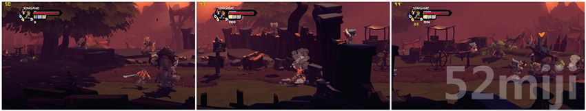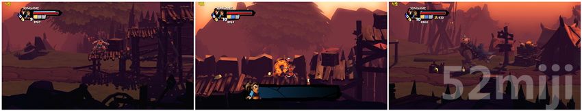 战斗分析:打败了Brute后。step1,通过木架来到城寨的城墙上,与矿工、兽人发生战斗。这里位置比较狭小,注意做好及时回避,而且这时的兽人已经可以自主发动疯狂乱砍,所以一旦被两只兽人在这里疯狂乱砍,吃补血要都来不及。step2,从城墙下来后,又能夺取一只骑行兽,一路把敌人踢飞即可,轻松又愉快。