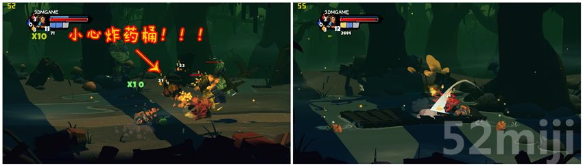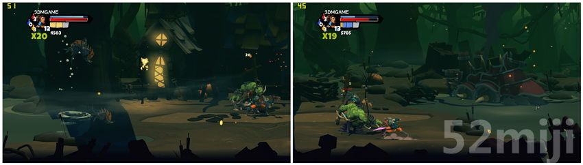 战斗分析:step1,萨满能够让其伙伴起死回生,所以如果要省时间的话先追着萨满打。萨满与兽人的搭配不太难对付,最麻烦的就是上方的火药桶,所以要当心它会爆炸;step2,来到沼泽前,就会有两只兽人潜伏在水中,轻松搞定后往沼泽中部走去,在这里分成两段食人鱼的袭击。尽量使用空对地(即,跳高往下击打的)技能。但是当食人鱼跳高攻击时,它们是进入了无敌状态,所以英雄一旦碰到跳高的食人鱼,都会受到伤害。食人鱼数量比较多,而且攻击分为了跳跃、冲击、潜行,数量一多就难以防备,所以尽量还是使用翻滚