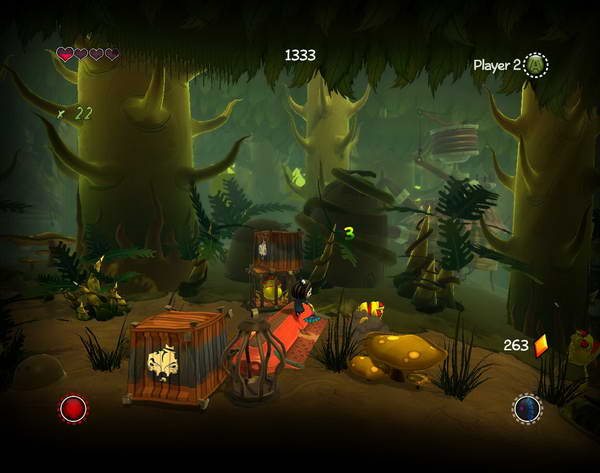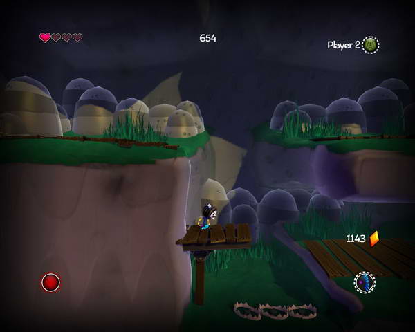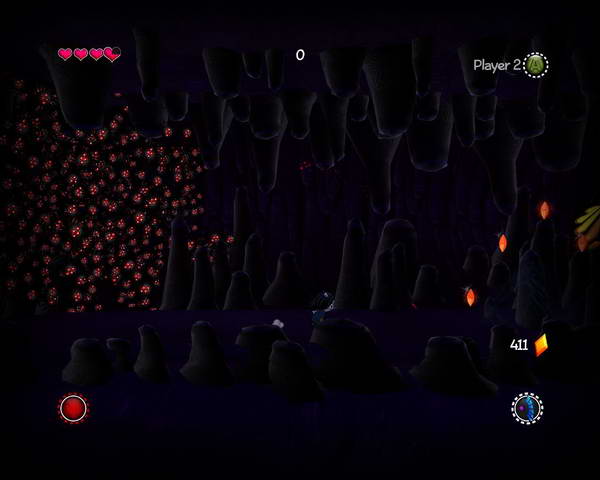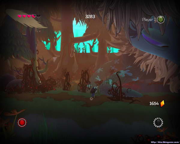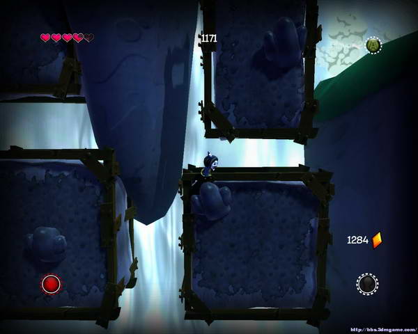 下来后千万不要站着不动岩石掉下去后下面有陷阱.来到森林里要小心树木和河水里的捕兽夹还有一只飞行敌人.