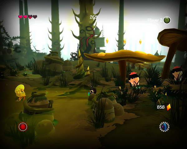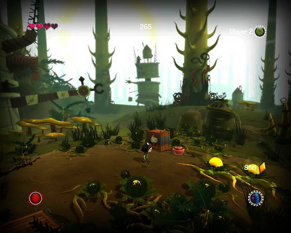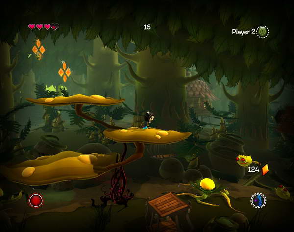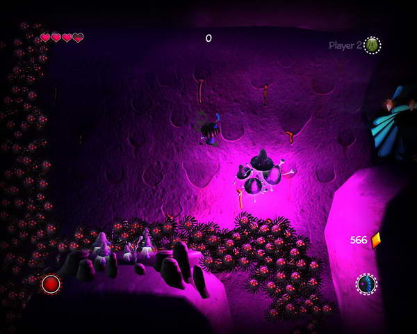前方酸液攀爬区注意会喷起的酸液最后的岩石直接双跳飞行到安全地区即可,在经过剧情敌人的石区后会有新物品的使用教程(拿起地上的蘑菇砸向不发光的蘑菇即可驱散剧情敌人)