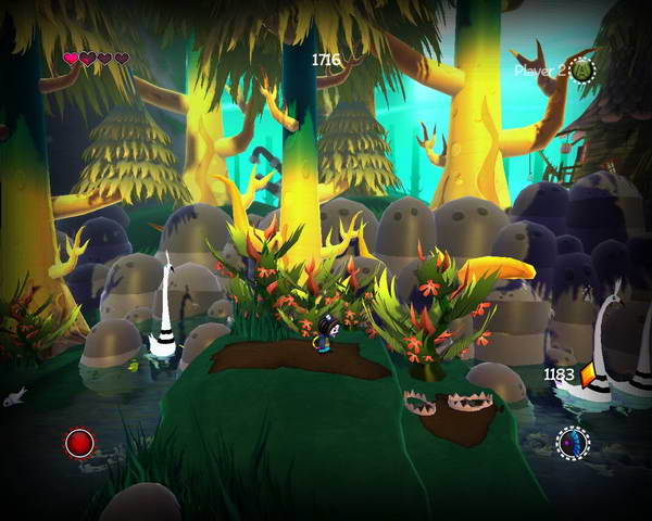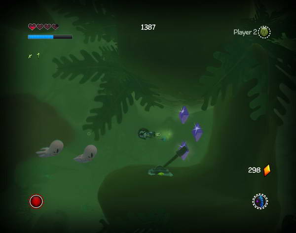 经过小池塘后注意上方两只青蛙会(注意躲避,池塘上有血条奖励),进入第二个池塘后按F可进行攻击(同时也有加速效果).从池塘上来时注意新出现的自爆植物(上前到植物面前引爆迅速撤回水里)
