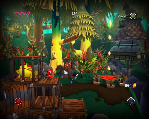 在通过一个木桩陷阱后利用树木从平台下方继续前进(不建议走上方,敌人较多陷阱也多)在陷阱尽头会出现少许杂兵击杀后继续通过陷阱.来到弹床处右侧会有商人,利用弹床跳起后再利用木桩跳跃(从左最左侧最高的木桩跳跃飞行到右侧一个偏高的木桩,再利用这个木桩飞在空中打开岩石下方的机关).上来之后会遇到两个飞行敌人(多拉开距离在空中按F攻击)解决后要注意旁边那棵等着很久的树,使用岩石对着靶子攻击即可开门