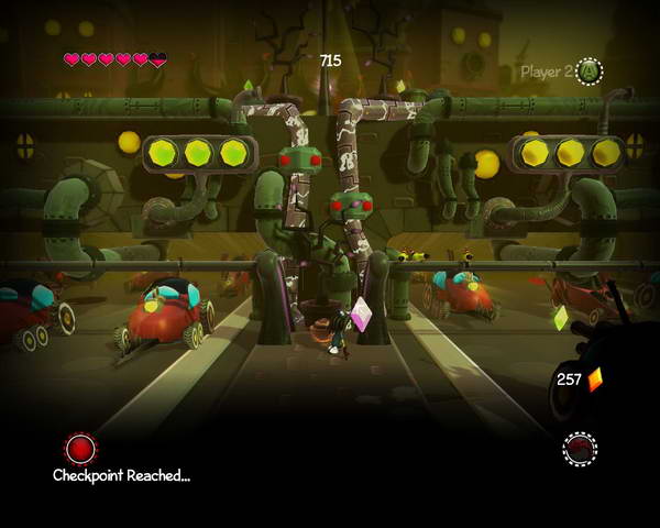 再次打开存档点继续通过车道来到尽头打开机关此时要尽量避免被撞,在回来的时候还会遇到两个蓝胖子的阻拦解决后来到刚才打开存档点的大楼攀爬,来到楼顶后打开机关(左上还有红心奖励)机关打开后跳下来往右走可以看到大门已开