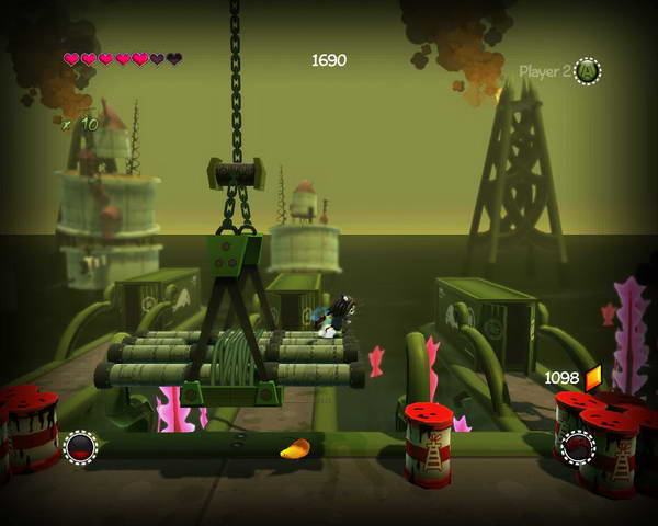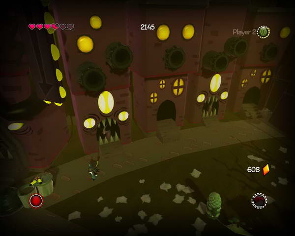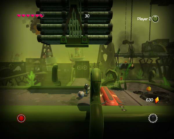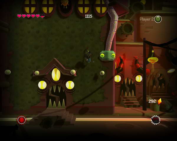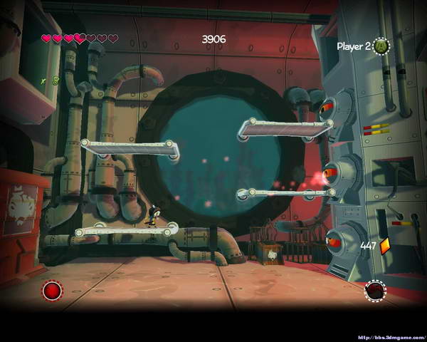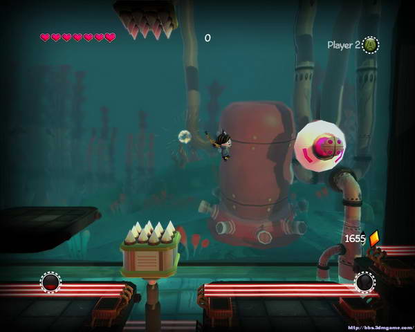 来到上面平台会出现第一章的怪兽全数击杀后再次利用几个挂钩通过机关,打开存档点后飞行前进(上下都有激光一碰就是1-3个红心)拿起石头通过反转平台砸开大门上的靶子通过大门后会出现3只山羊(可以使用D打上去让激光帮忙),打开第二个存档点后利用蹦床前进(在跳起后到一定高度按住空格飞行过去)到达下面平台解决掉一些敌人后进入房间里面会有电从上攻击玩家,通过房间利用挂钩前进来到第三个存档点打开后前进
