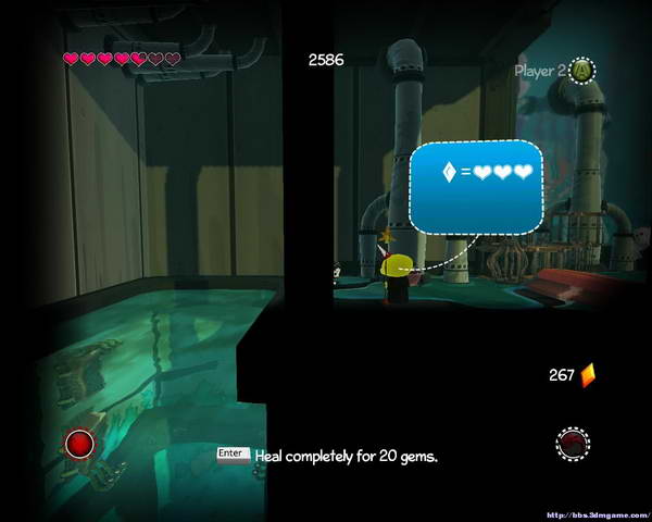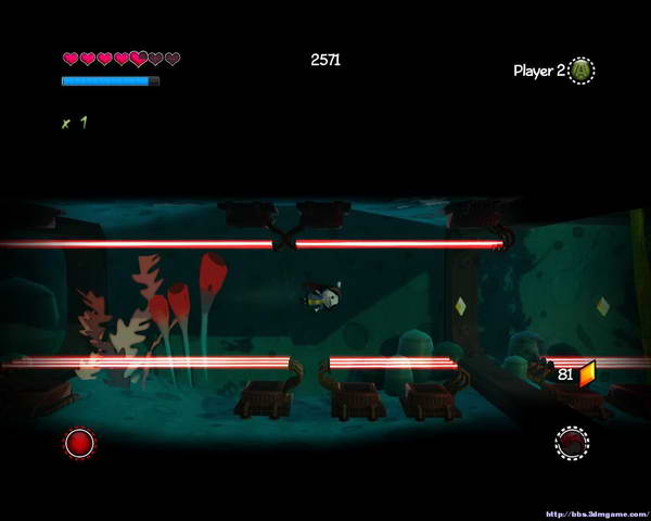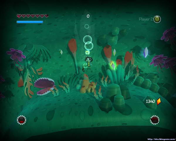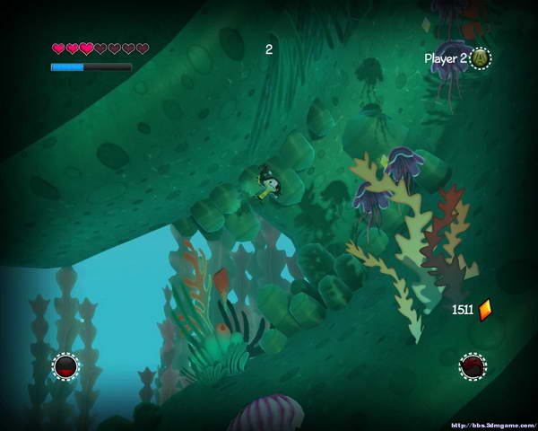前方有鱼攻击的岩石中心有红心奖励,一路前进后快到过关点时肯定是要没氧气扣血的(这时玩家收集的红心就有用场了)