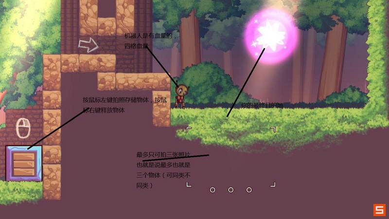 最后则是游戏的操控,移动为WSAD模式,SPACE为跳跃,鼠标左键为拍照,右键为释放照片。游戏的方法是通过拍照将物件在不同区域内转移从而达到通关的效果