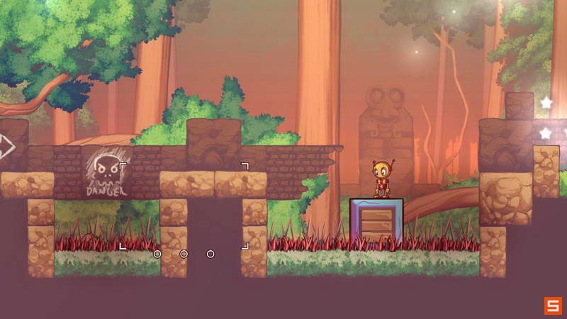 注意第一关的斜平面放置弹簧草的方法。这个技巧很重要,后面的很多场景都需要斜放置弹簧草从而让机器人快速飞跃极长的障碍(远比竖直跳跃高许多,因为重力的束缚斜跳比直跳要小)