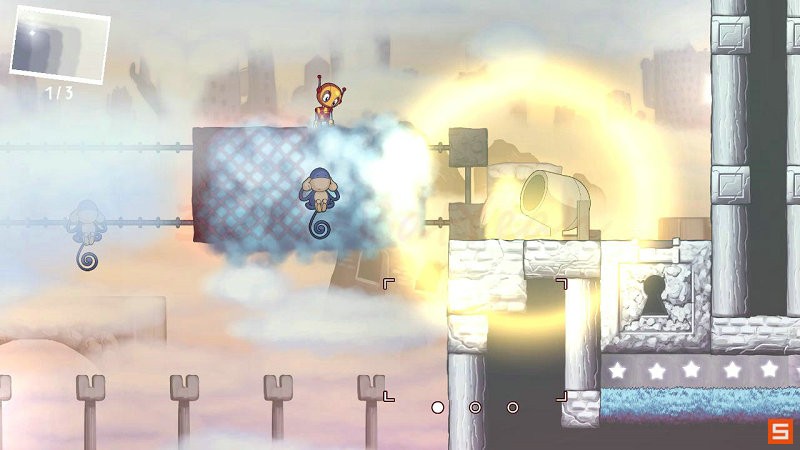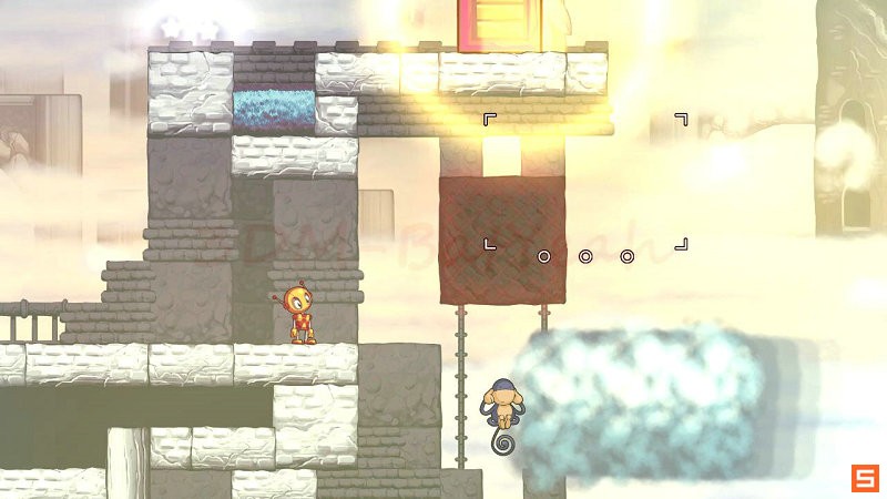 飞云平台。这里的猴子是控制飞云平台的关键点。玩家所要做的则是放置飞猴从而让平台移动到高处。这里难度不是很大,注意一点的是飞云可以穿越障碍但是人物不能