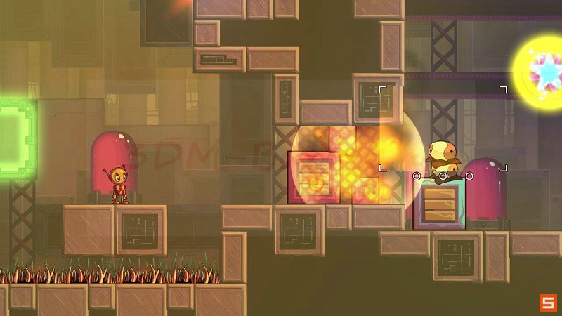 相当有难度的关卡。箱子和弹簧草都要复制;然后斜放一个弹簧草;其余的道具要全部保存携带(非常重要);然后来到两个高台的中间,将两个箱子叠罗汉在将弹簧草放置到最高点即可跳跃到出口