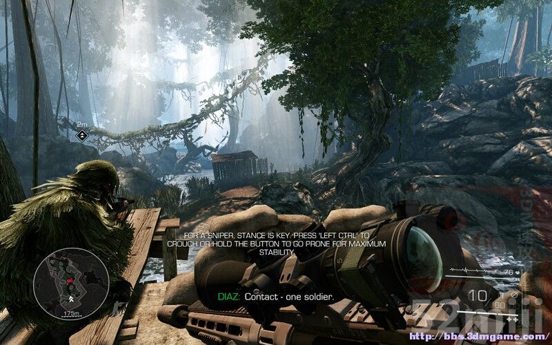1.第一关为教学关,游戏操作非常简单,和一般的FPS游戏一样。玩过前代以及狙击精英的玩家会很快上手。