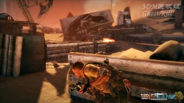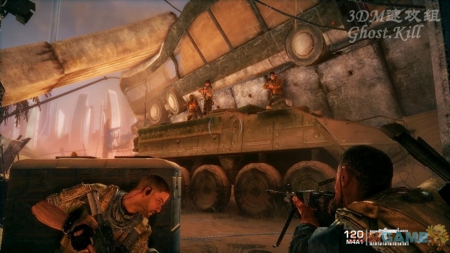继续前进来到图中位置,有个使用机枪的敌人火力压制,没法轻易过去,按鼠标中建命令队友使用战术手雷肃清敌人位置,跟着队友捡个剩就可以了。需要注意的是自己枪的子弹不多,建议把手枪换成敌人的武器,按住R即可更换。