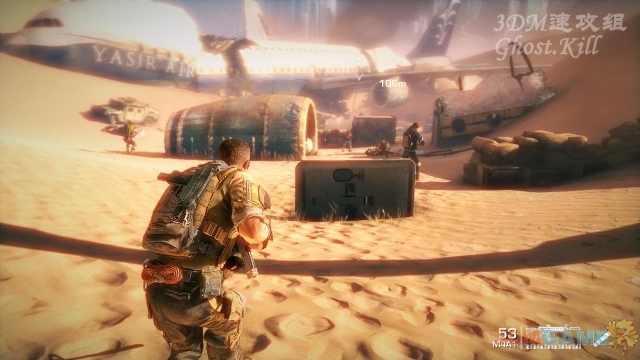 来到任务点遭遇敌人,攻击他们头顶上的玻璃,打碎后里边的沙子会把他们压死,游戏里很多地方要利用这种环境因素干掉敌人。