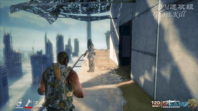 继续狙击,右边的机枪可以通过打碎玻璃让沙子流进来破坏掉。杀光后再乘滑索哈到对面,