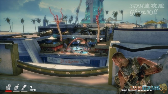 从房顶跳下来,干掉这个狙击手后杀到隔壁有篮球架的房间,换上狙击枪干掉远处的敌人狙击手,也可以直接命令队友干掉他们。然后乘滑索到对面建筑里,处决里边的敌人。