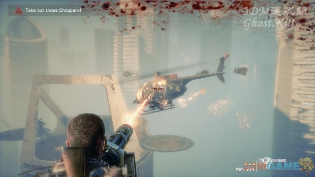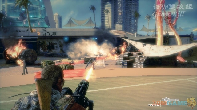 过场动画后下楼去停机坪,一路上敌人不少,一个队友在楼上的房间狙击掩护,可以命令他干掉敌人,最后听到他的指令说路上没有敌人后直接跑到直升机那里使用机枪掩护队友撤退。
