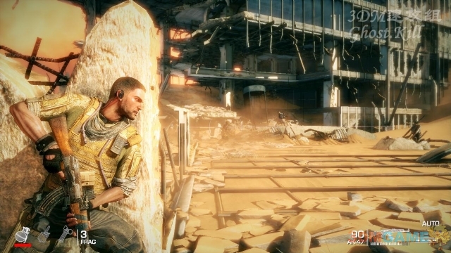 一路杀到图中这里,遭到大批敌人埋伏,无限刷兵。图中位置有个弹药补给箱,但补充的不多,要省着用。这个掩体一会也会被敌人的RPG炸掉,迅速跑到队友所在的掩体后面,一直坚守到沙尘暴袭来,脚下沙子会陷下去,掉到下边的建筑里过关。