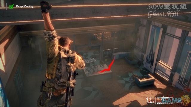 杀光敌人继续前进,途中脚下的玻璃被敌人打碎,悬在空中干掉楼下房间的几个敌人,然后落地。这里有一种拿刀子的敌人,称他离得远的时候干掉,离近了也别跟他近战,打不过。这里也清场后乘滑索到对面的大楼,打开一扇门后被涌入的沙子淹没。