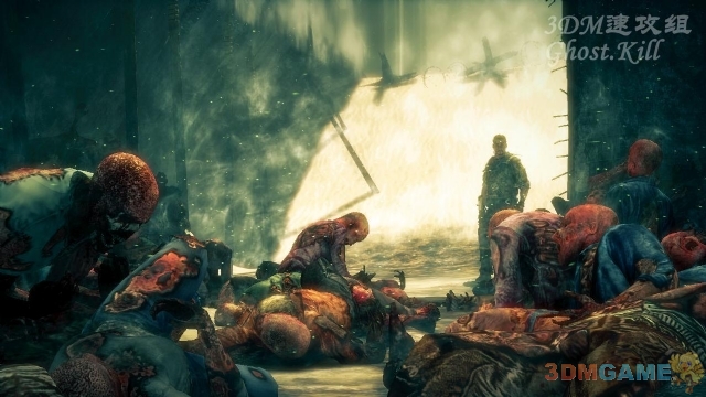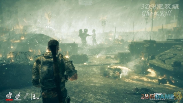 穿过轰炸区开始和敌人火拼,从室外一直杀到室内,肃清之后从另一扇门离开后过关。