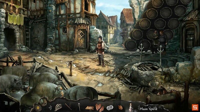 下面则是开始我们的序幕,水彩画风之下,我们的男主角正在被两个流氓按在猪圈水槽上教训。序幕没有什么太重要的部分,只是让玩家熟悉一下整体的游戏系统和操作