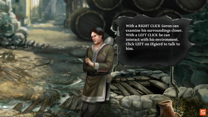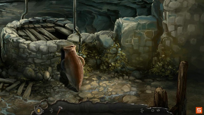 下边栏最左边的两个代表GERON可使用的魔法技能。魔法技能可破坏某些场景的特殊建筑物。如初识的魔法技能可以破坏一些瓶罐之类的物品。中间的则是物品栏,点击物品与相关的物品互动进行推进整个游戏进程。一般来说,每个物品与某物件可互动的情形下,该图标会显示出亮色