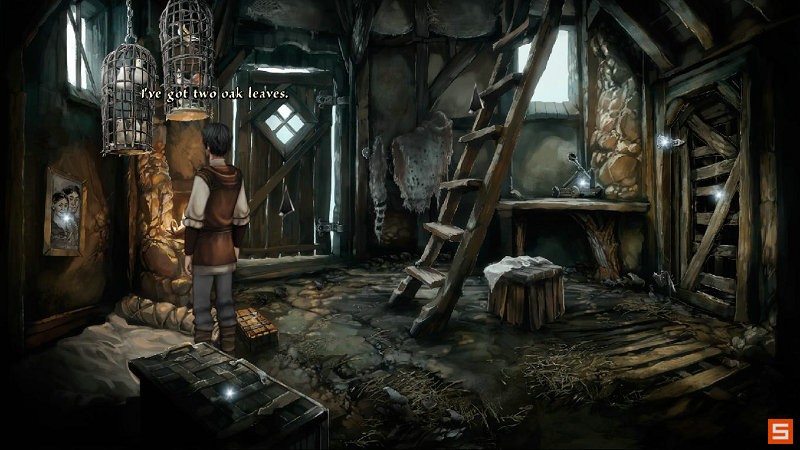 从小屋出来同OLEIGRD对话,他们肯定是不会把GERON当回事交还第三个OAR LEAF的。进入该场景右边小屋来到楼上,探听到楼下OLEIGRD和他的仆人之间的对话;得知一个OAR LEAF藏在守卫的衣服里面。