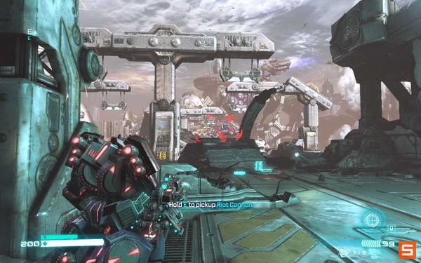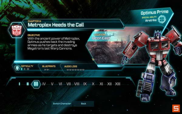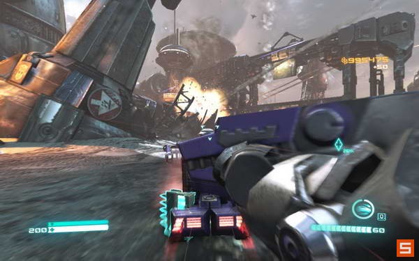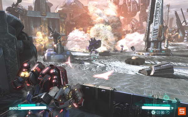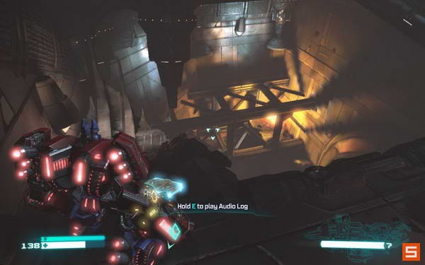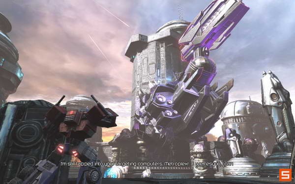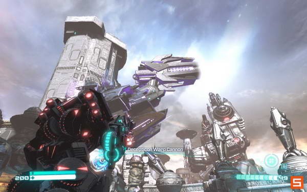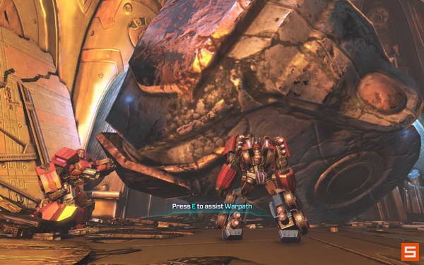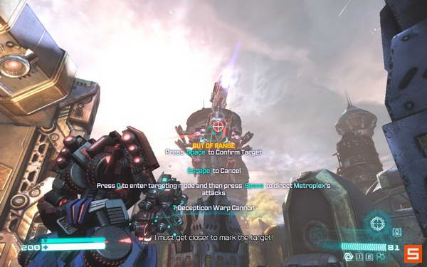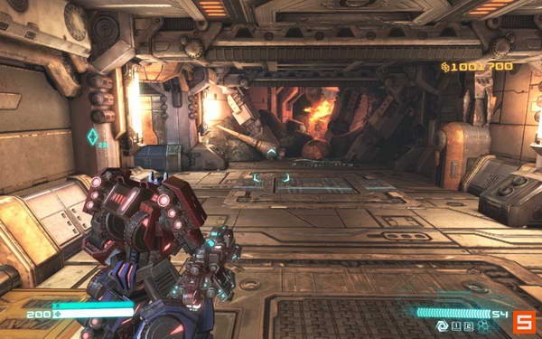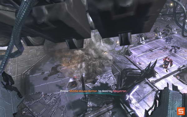 之后两人分兵前进,擎天柱急速冲到第一个炮塔的区域。而猛大帅则是一路边剿灭敌人边往目标冲击。这里就是让玩家练习一下在变身为机器模式下的操作。左键是攻击,右键一般为冲刺,Q或者F则是特殊技能(如加速)。如果有额外的武器,则可以通过鼠标滚轮切换武器。