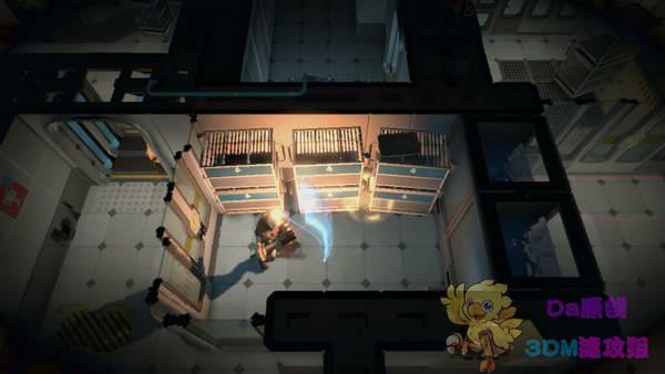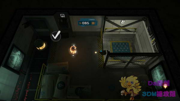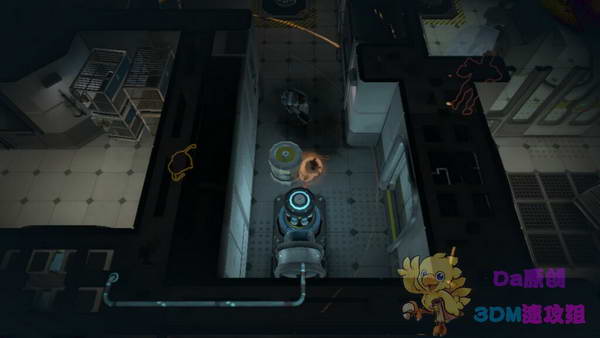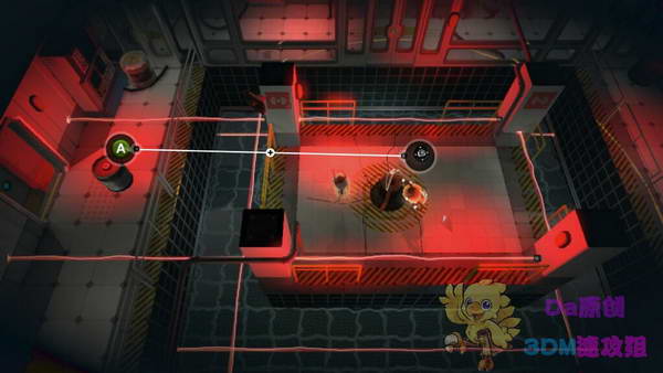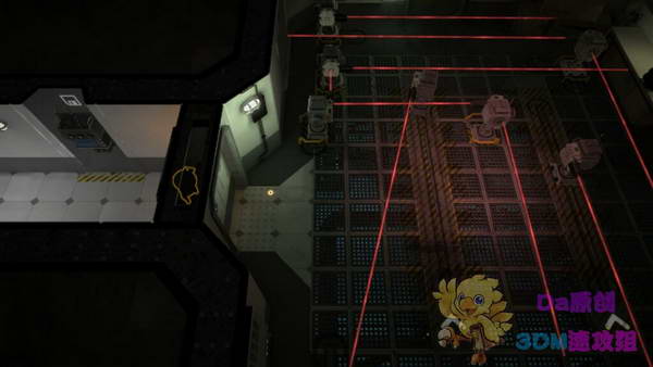 因为只有下边运输带才有不怕镭射线的桶子,所以要先藏在下边的桶里