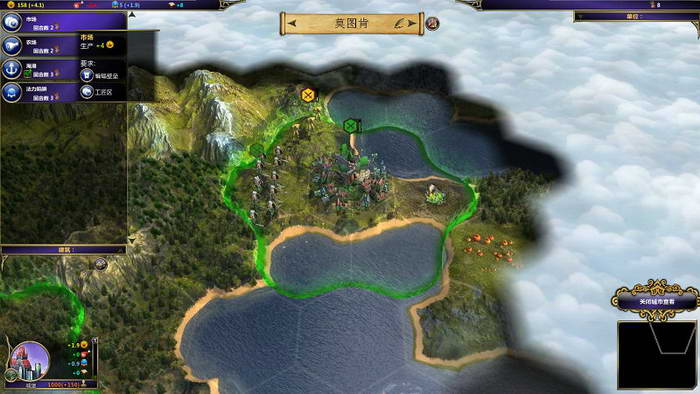 譬如下图所夺取的三级城市,两边临海,地势狭窄而且可作为产出建筑物的资源不是很丰富。所以该城市可以作为前线暴兵城市方针进行建设